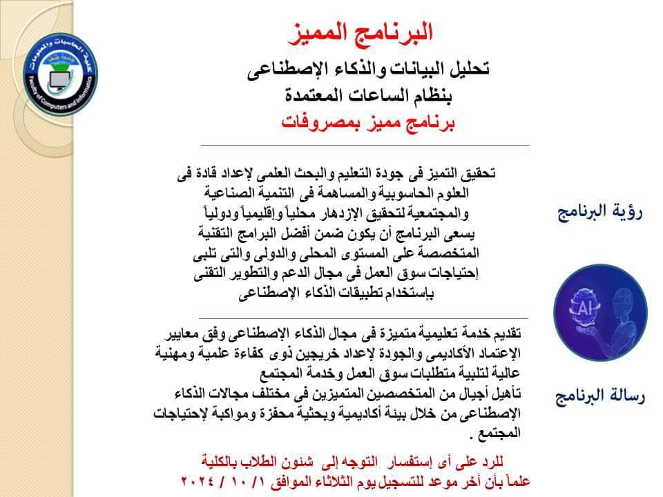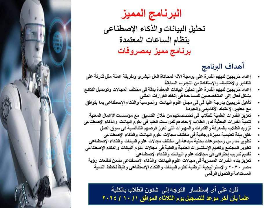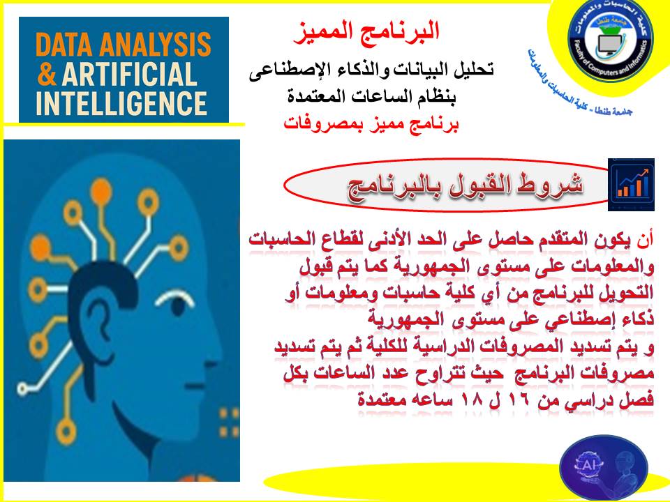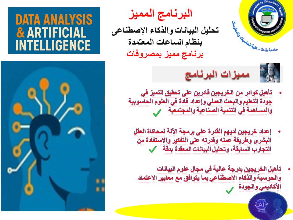 برنامج "تحليل البيانات والذكاء الاصطناعي" يعمل على إعداد خريجين لديهم القدرة على برمجة الآلة لمحاكاة العقل البشرى وطريقة عمله وقدرته على التفكير والاستفادة من التجارب السابقة، وتحليل البيانات المعقدة بدقة وتأهيل الخريجين بدرجة عالية في مجال علوم البيانات والحوسبة والذكاء الاصطناعي بما يتوافق مع معايير الاعتماد الأكاديمي والجودة.